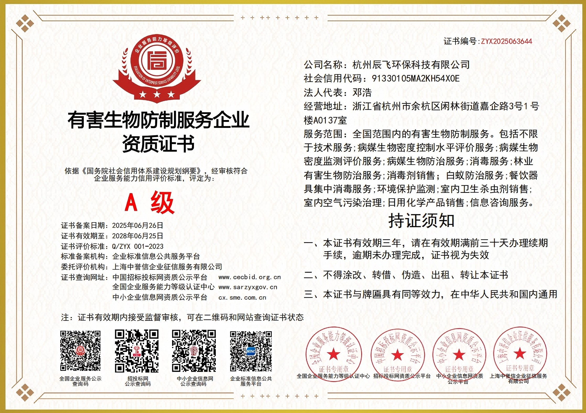 杭州辰飛環(huán)保科技有限公司是一家專業的PCO有害生物防治服務機構。是經杭州市工商局注冊登記、杭州市白蟻防治管理所、PCO協會批準的城市害蟲綜合治理消殺公司,是集除四害、白蟻消殺、除蟲、消毒殺菌、室內空氣污染治理、藥械銷售于一體的大型專業杭州有害生物防治科技有限公司。主要從事新建、擴建、改建、裝飾裝修單位建筑物的白蟻防治和白蟻預防工程,同時從事工廠、酒店、企事業單位、住宅小區和家庭的”四害”消殺和白蟻防治服務,長期向各類型客戶提供杭州白蟻消殺、除蟑螂、除老鼠、除蟲、消毒殺菌等優(yōu)質服務。 本公司自成立以來,秉承“誠信、敬業、高效、務實”的發(fā)展原則,以現...